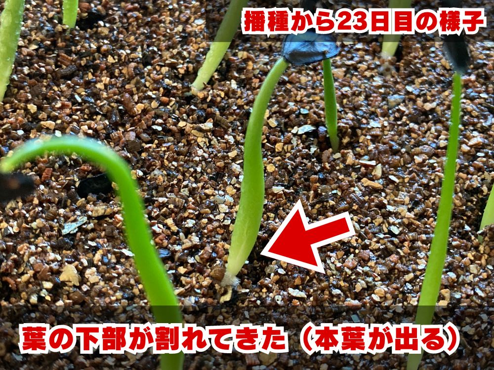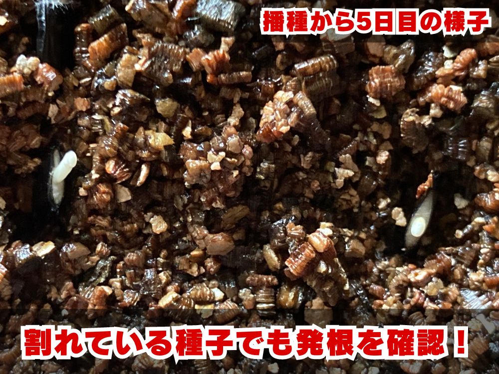 また、試しに半分に割れていた種子も蒔いていたのですが、2つほどが発根してくれました。おそらくですが、種子の中の胚乳が傷ついていなければ発芽してくれるのだと思います。