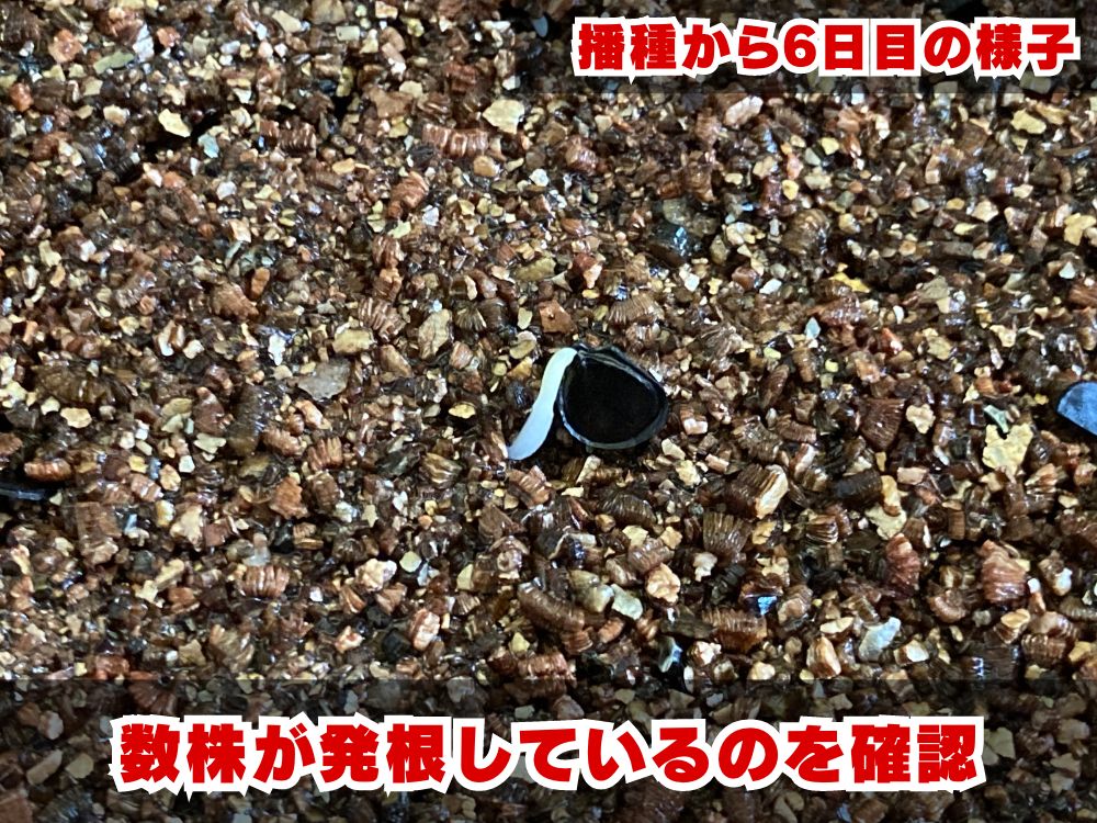 種子を蒔いてから5日で発根を確認することができました。まだ芽は出ていないようですが、種から白い根が顔を出しています。