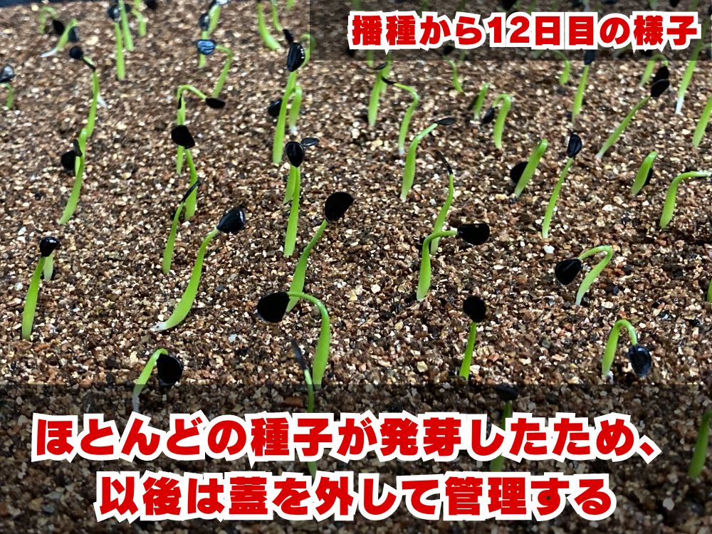 種子に水を吸収させるために、種を蒔く前に浸水させたり、蓋をして空中湿度を上げることが必要になってきます。