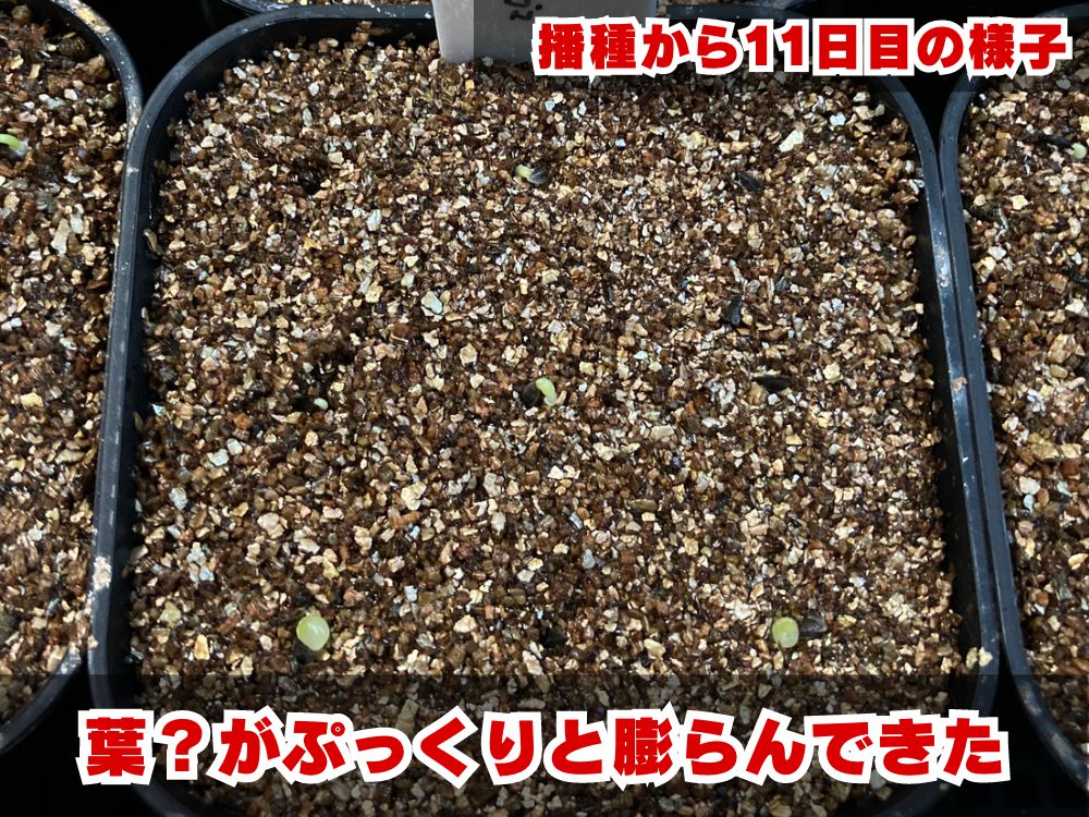 種子を蒔いてから10日経過したところで、ようやく2つほどの種子が発根しているのを確認することができました。まだ芽は出ていないようですが、種から白い根が顔を出しています。